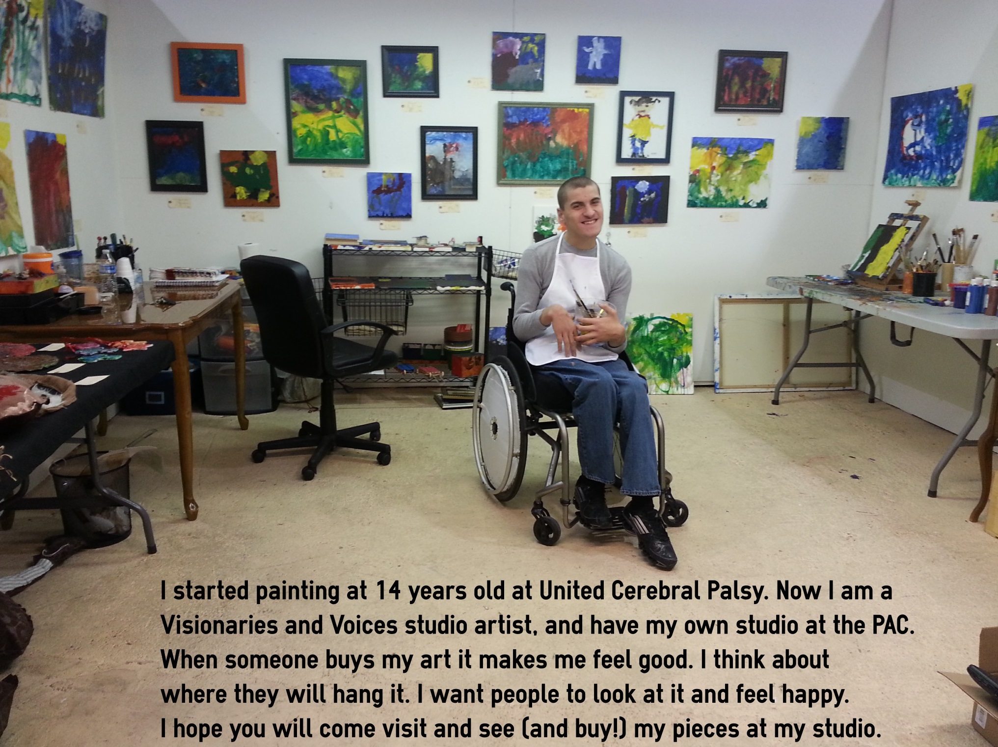 “I like to make art, it is fun for me. When I graduated from high school I tried a lot of job programs, but I didn’t want spend my day in workshops. I told my parents I want to make art. When someone buys a piece of my art it makes me feel good. I think about where they will hang it, and I want people to look at it and feel happy.